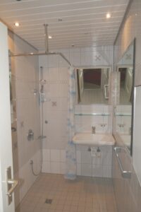 Gäste – WC mit Waschbecken, EG-Tageslichtbad mit WC, Waschtisch und begehbarer Dusche (2015).