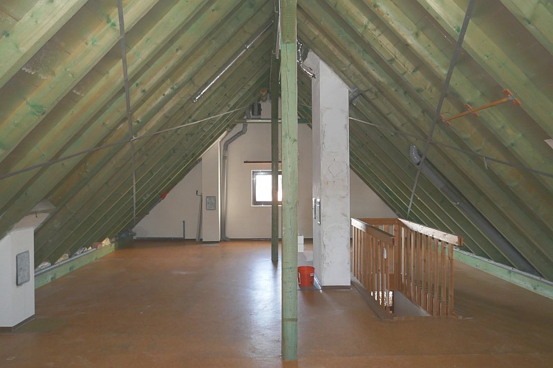 Zum Spitzboden führt eine massive Holztreppe.